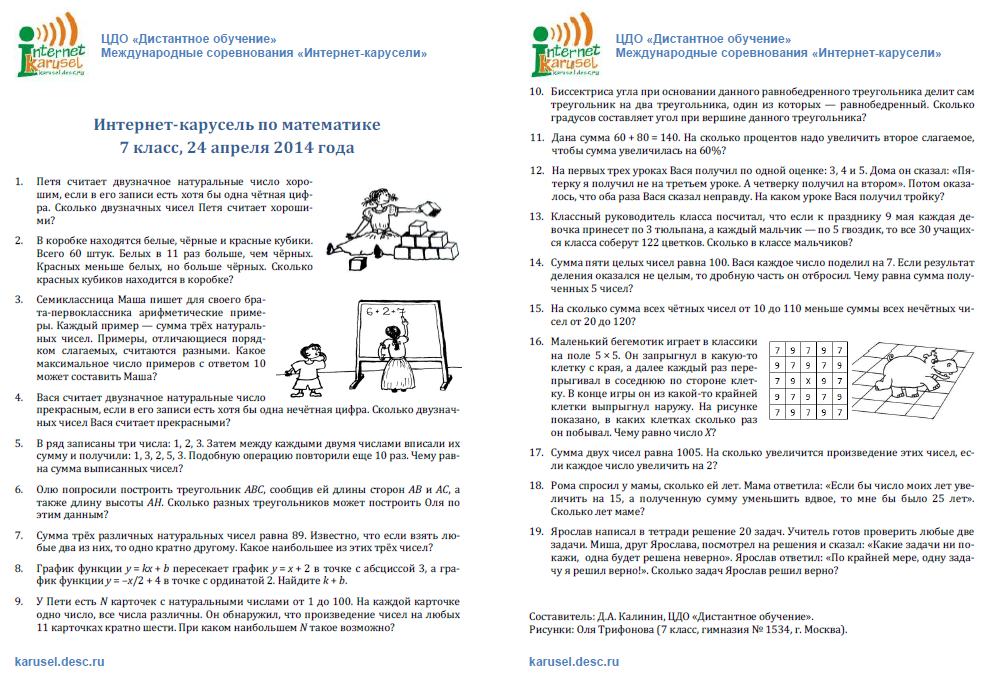 Интернет-карусель по математике для команд 7 классов прошла 24 апреля 2014 года. В ней приняли участие около 200 команд из России, Беларуси, Казахстана и Туркменистана.