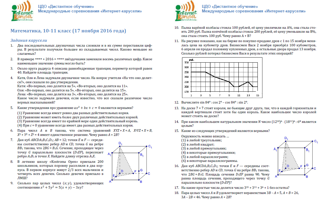 Интернет-карусель по математике среди команд 10-11 классов прошла 17 ноября 2016 года. В ней приняли участие около 155 команд. Участникам предлагались задания уровня ЕГЭ, вступительных заданий в ВУЗы и олимпиад.